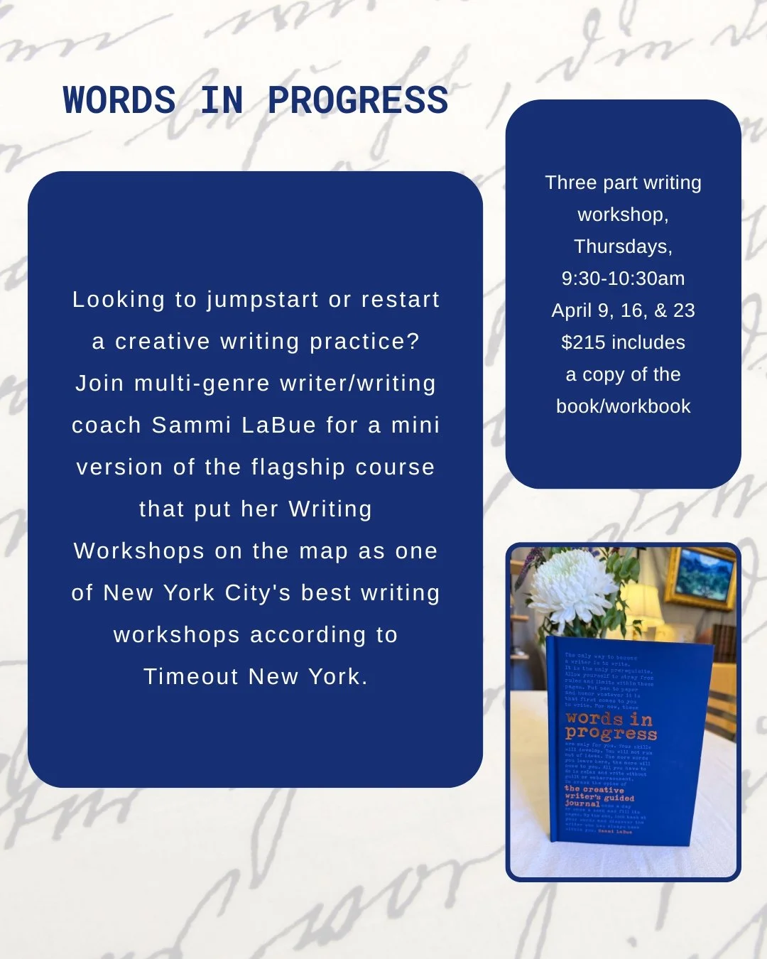 Price includes a copy of Sammi's creative writer's guided journal, Words in Progress, full of 75 prompts and craft lessons.